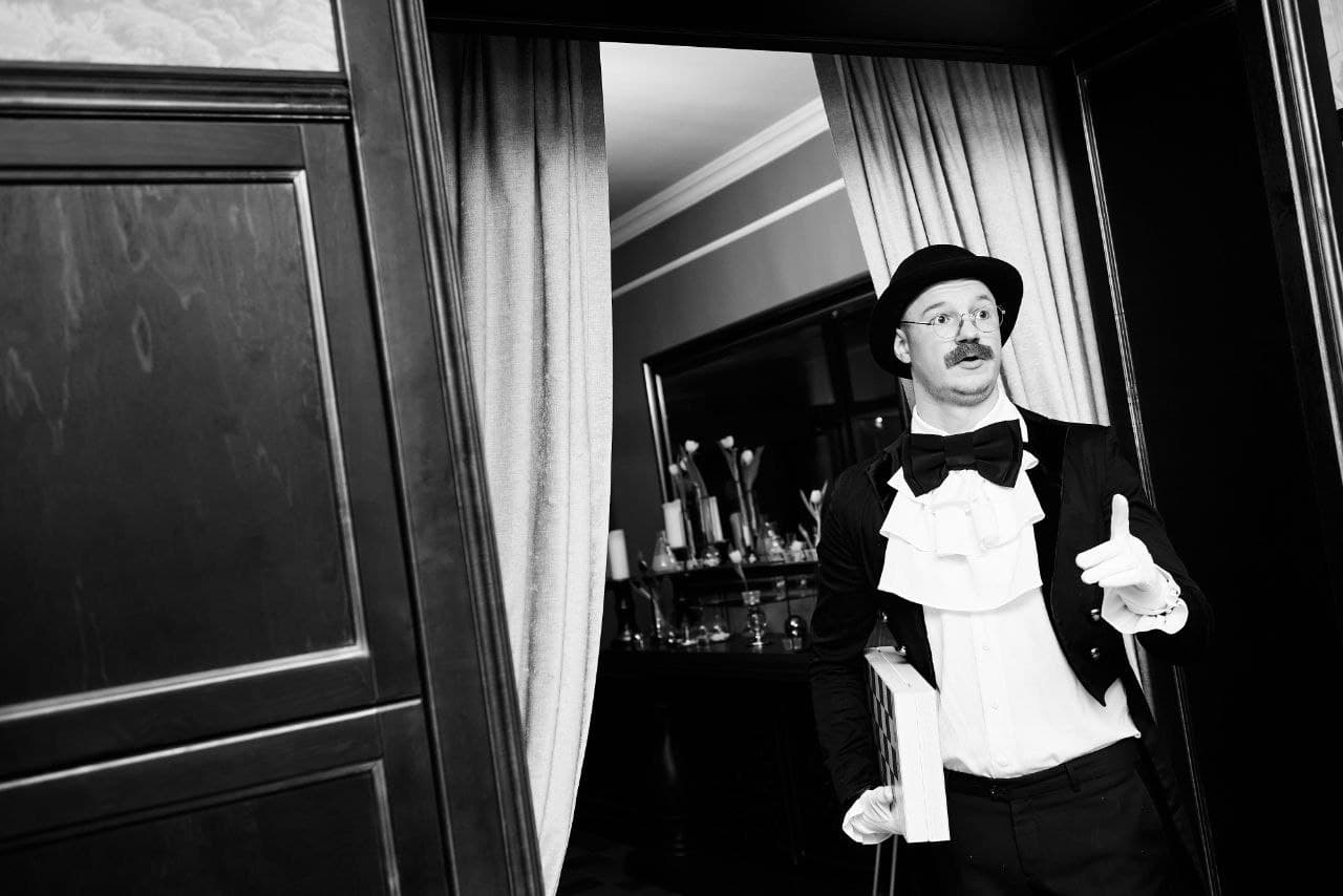 Аниматор воспитан, аккуратен, внимателен к каждому, не знает бранных выражений, но всегда подберет изысканный комплимент индивидуально для вас. Одни словом – Джентльмен. Как знаток этикета, он незаменим на встрече гостей: откроет перед вами двери, примет одежду и поможет в гардеробе. Обучался хорошим манерам в лучших частных школах Англии, поэтому не чихает в принципе. Одет в классический фрак, черную бабочку и цилиндр. Его аристократичный вид и очарование найдут великолепное применение на выпускном, открытии выставки или торжественном вручении наград.
