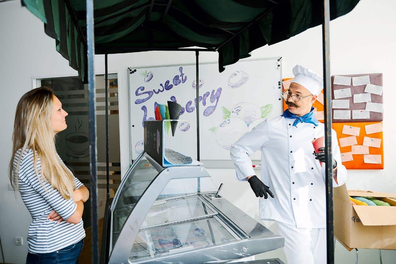 Актёр-аниматор изготовит веселое настроение из любых подручных продуктов. Повар займется кухней ваших эмоций на тематической вечеринке, открытии ресторана, выставке, промо-акции магазина или кейтеринга в Минске и не только. Его большой белый колпак и светлый халат видны из далека, а сам он является на запах хорошего праздника. Забавный мастер-шеф поделится вкусными шутками, растворит кислую мину строгого критика сладким комплиментом, состряпает смачное селфи и добьется расположения опытных гурманов. Его шедевры готовятся не в кастрюлях, а на лицах гостей и фотографиях с ними.